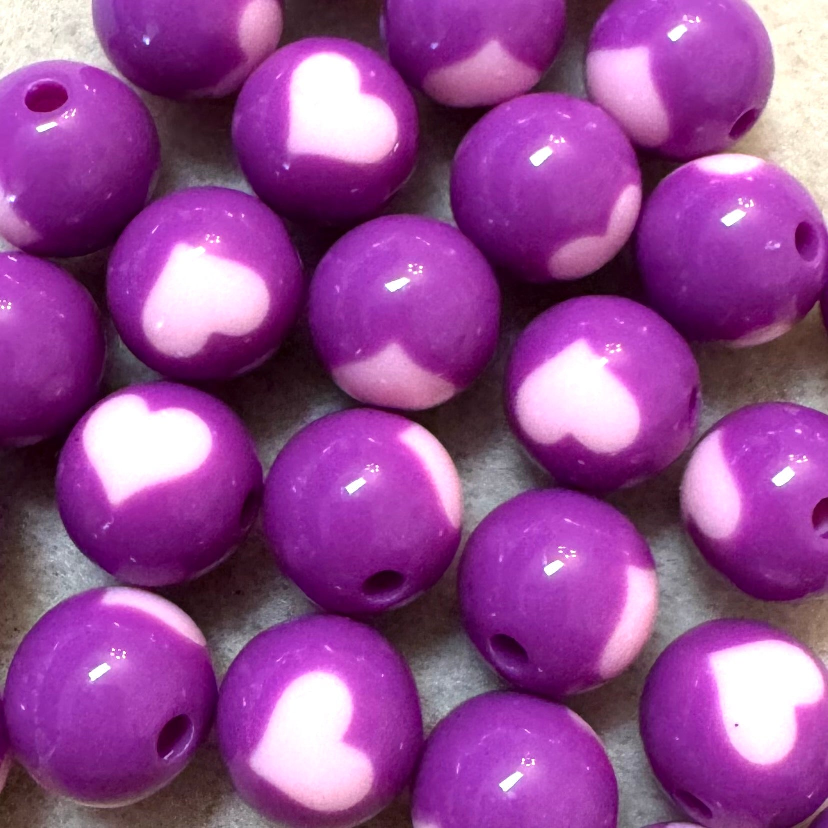 BCB-2245 - Acrylic Round Beads With Heart, Violet/Pink, 12mm | Pkg 15