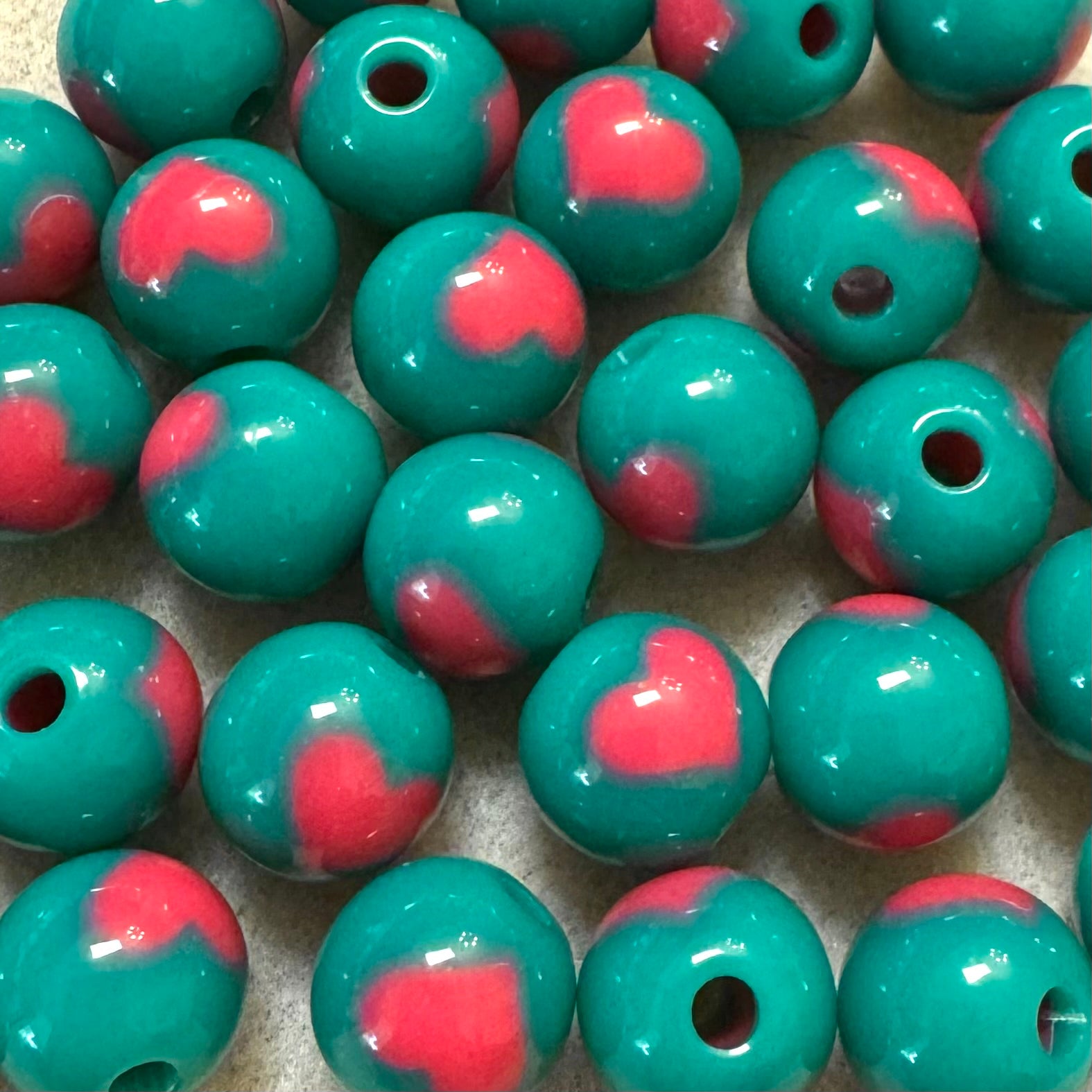 BCB-2246 - Acrylic Round Beads With Heart, Teal/Rose, 12mm | Pkg 15