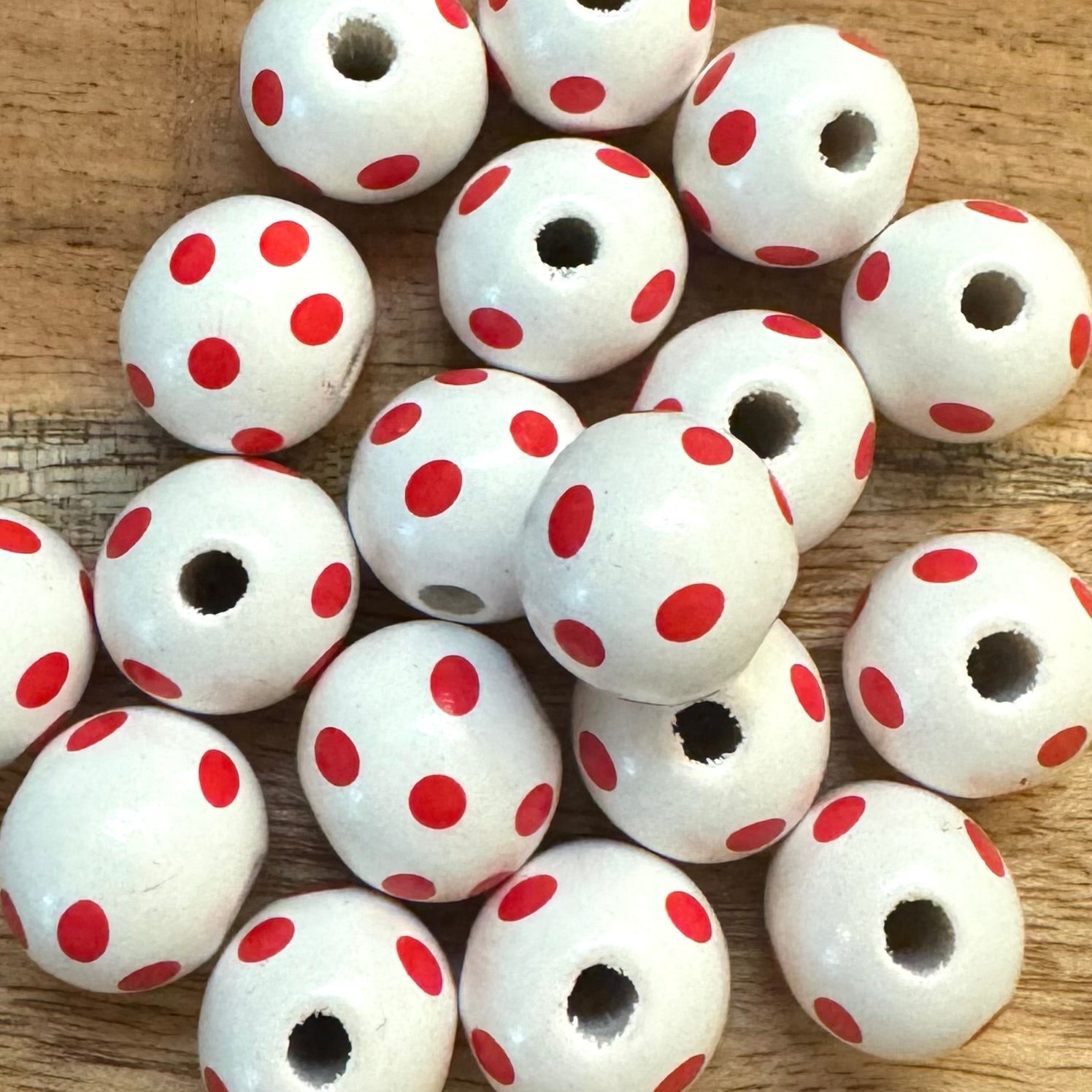 BCB-2276 - Wood Focal Beads, White With Red Dots, 16mm | Pkg 10