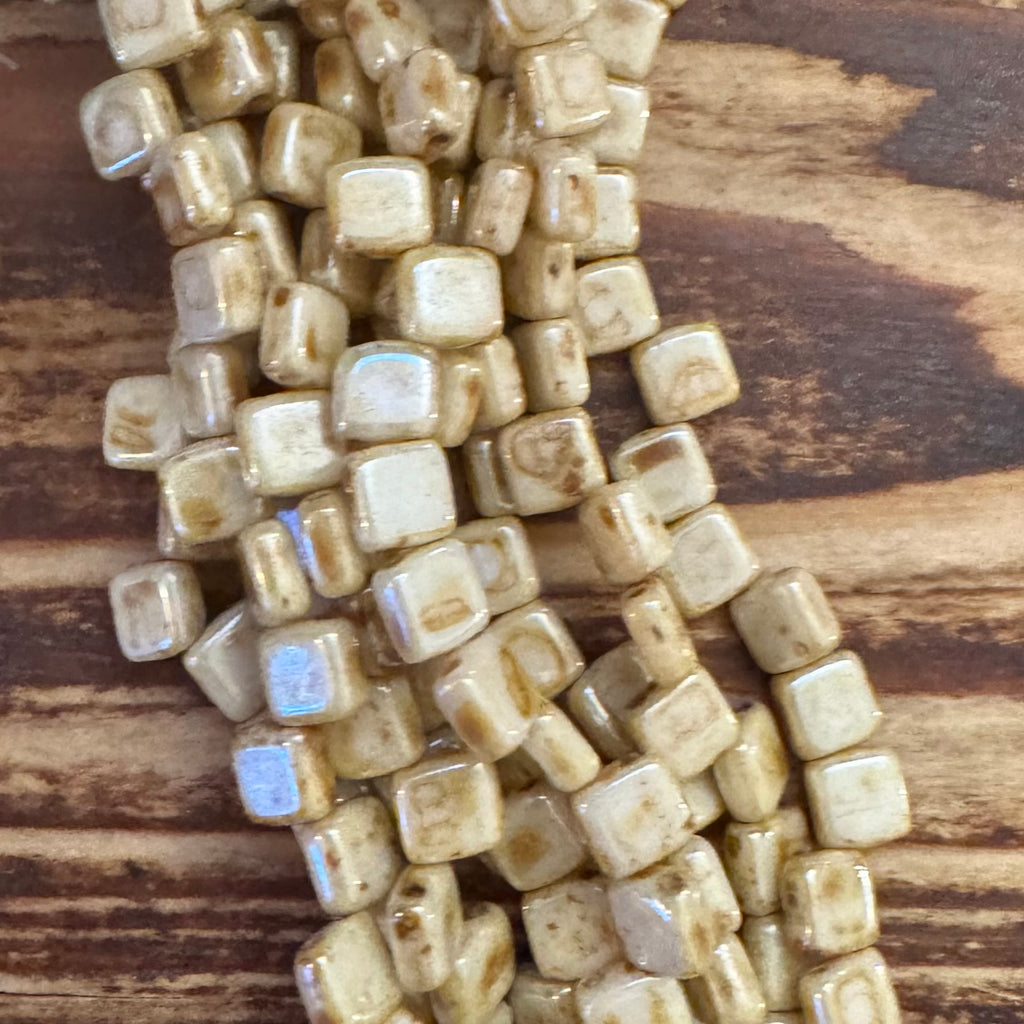 Lot-002 - Czech Glass 2 Hole Tile Beads, Picasso Tan, 6mm | 9 Strands
