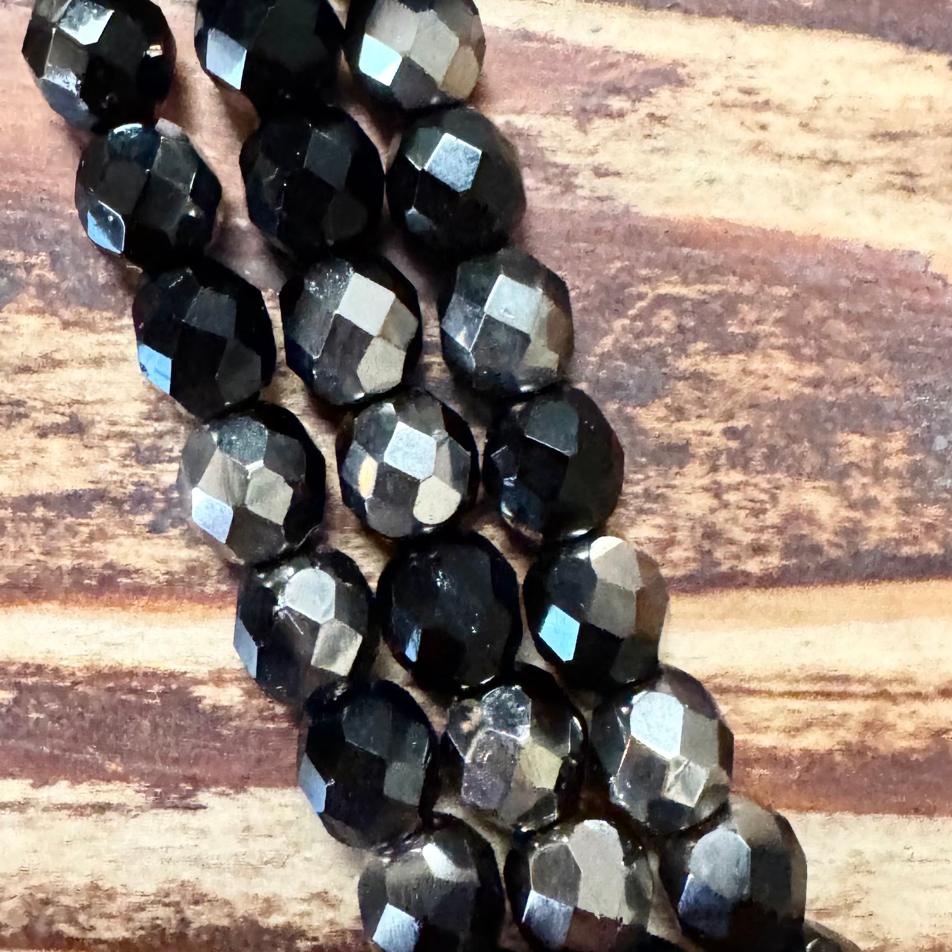 JKB-1074 - Czech Glass Fire Polish Beads, Jet/Silver, 8mm | Strand