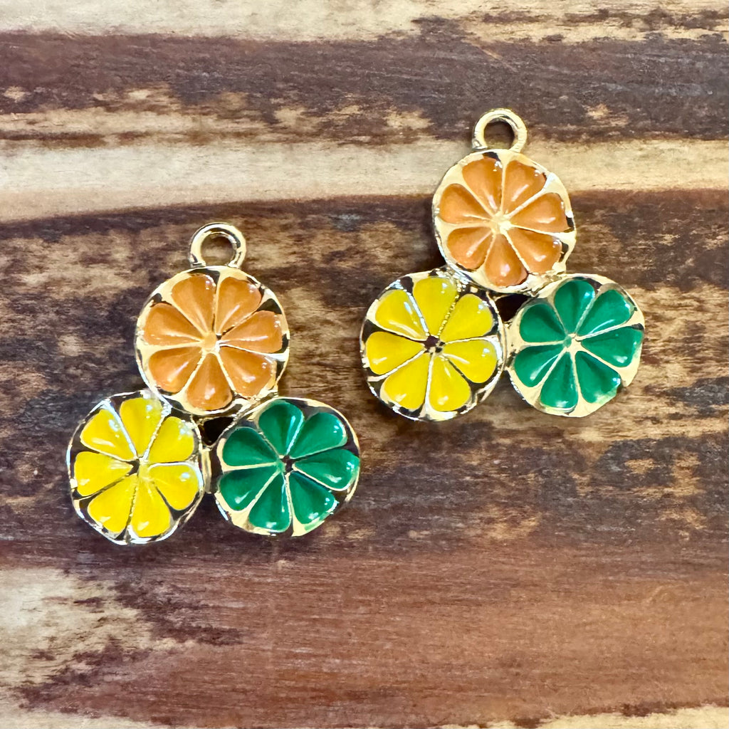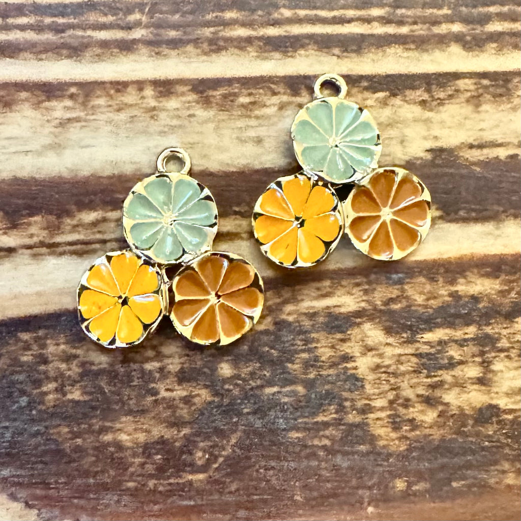 BCB-1257 - Antique Gold Enamel Triple Flower Charm, Muted Green/Yellow, 17mm | Pkg 2