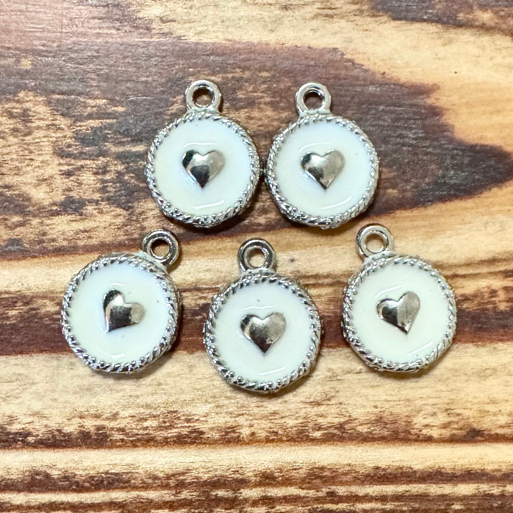 BCB-1573 - Antique Silver Enamel Charms With Heart, White, 12x15mm | Pkg 5