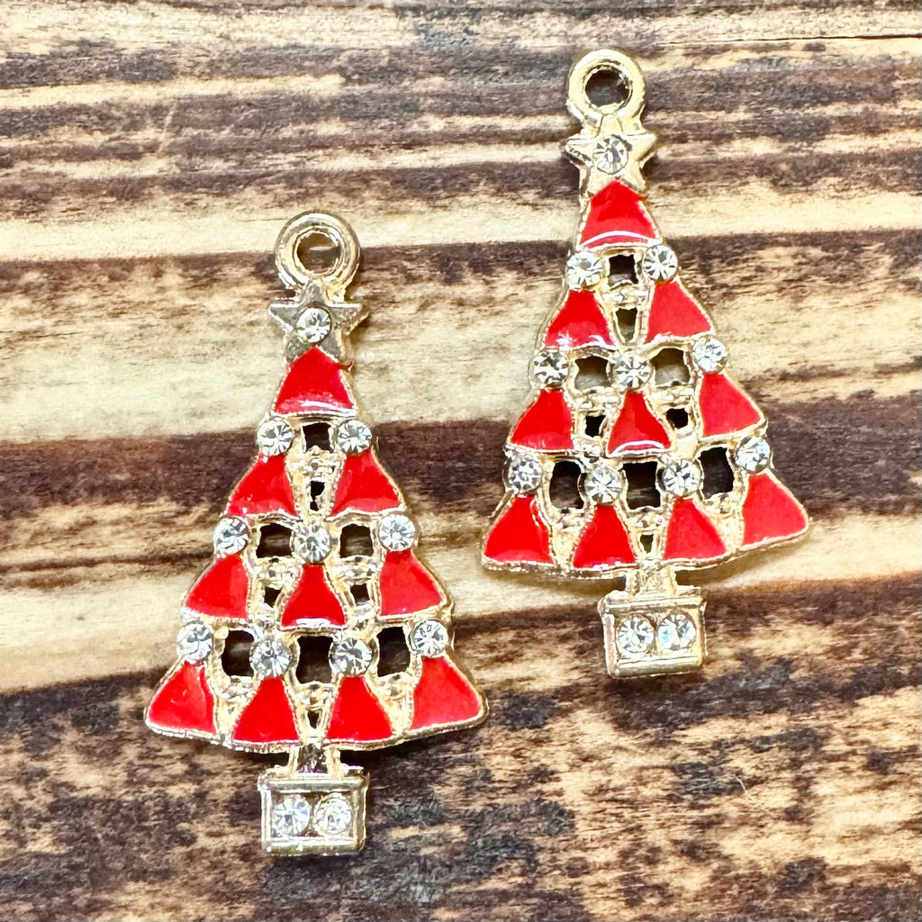 BCB-1278 - Gold Plated Enamel Pendant, Red Christmas Tree With Crystals, 33x18mm | Pkg 2
