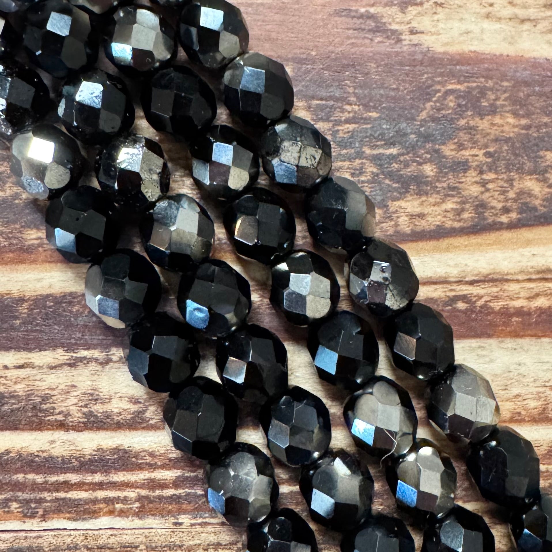 JKB-0868 - Czech Glass Fire Polish Beads, Jet/Silver, 7mm | Strand