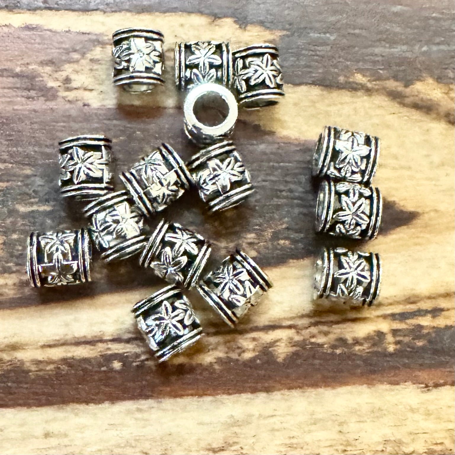 BCB-0942 - Antique Silver Beads, Tube With Flowers, 6mm | Pkg 15