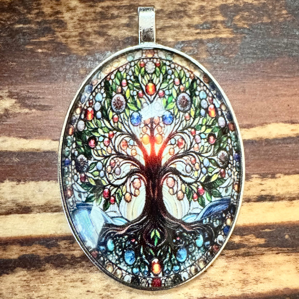 BCB-1482 - Silver Enamel Oval Pendant, Blooming Tree Of Life, 37x50mm | Pkg 1