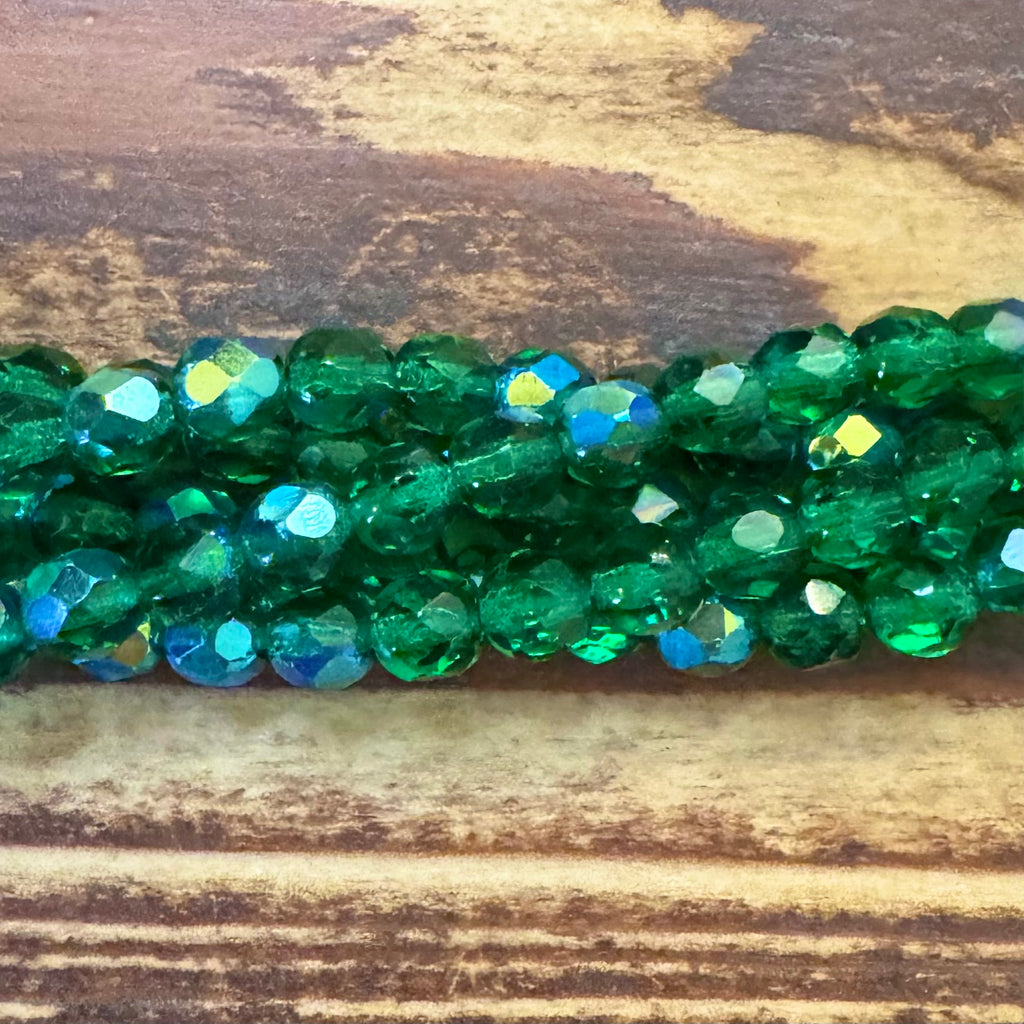 JKB-0939 - Czech Glass Fire Polish Beads, Emerald AB, 6mm | Strand