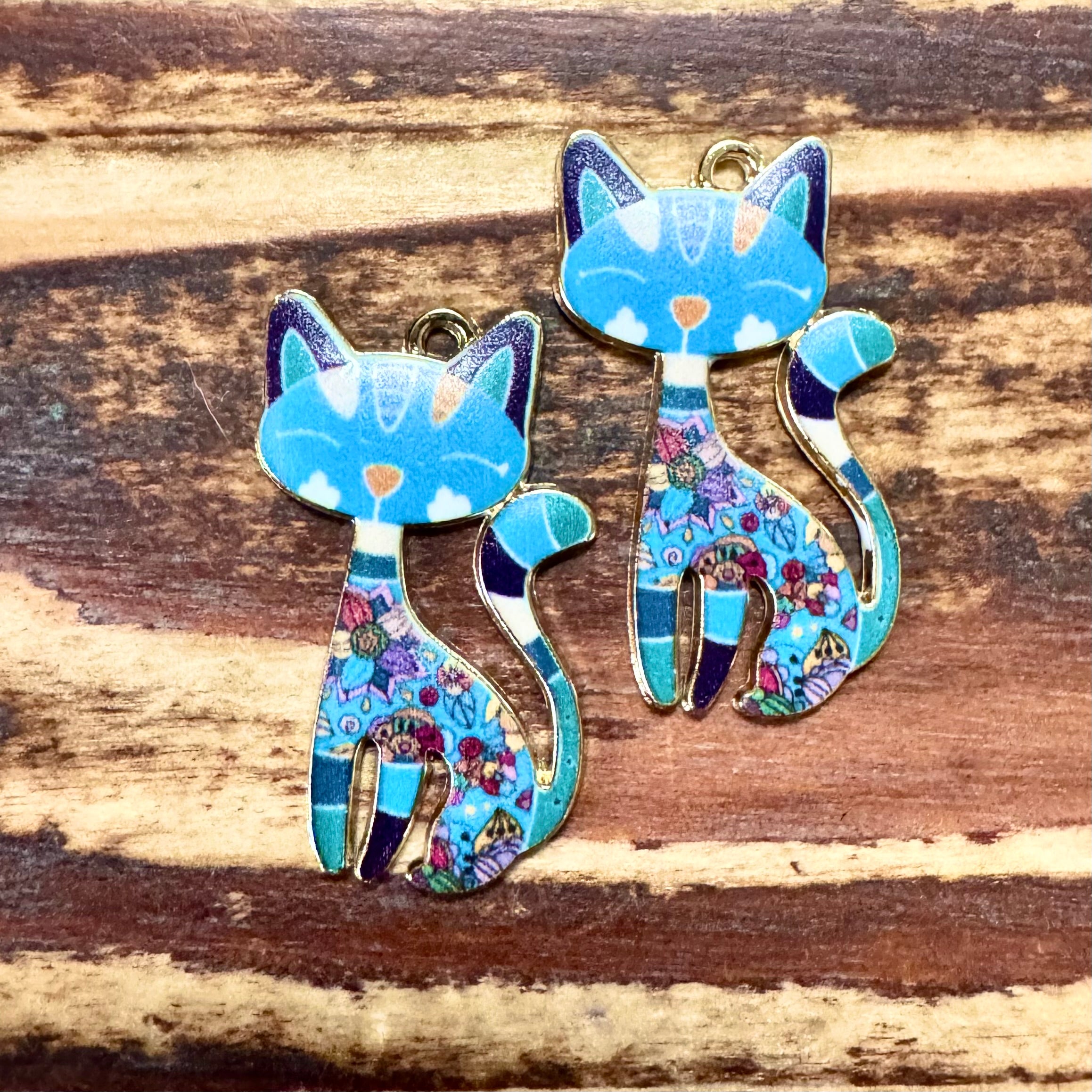 BCB-1346 - Antique Gold Enamel Pendant, Cat With Turquoise Face, 19x30mm | Pkg 2