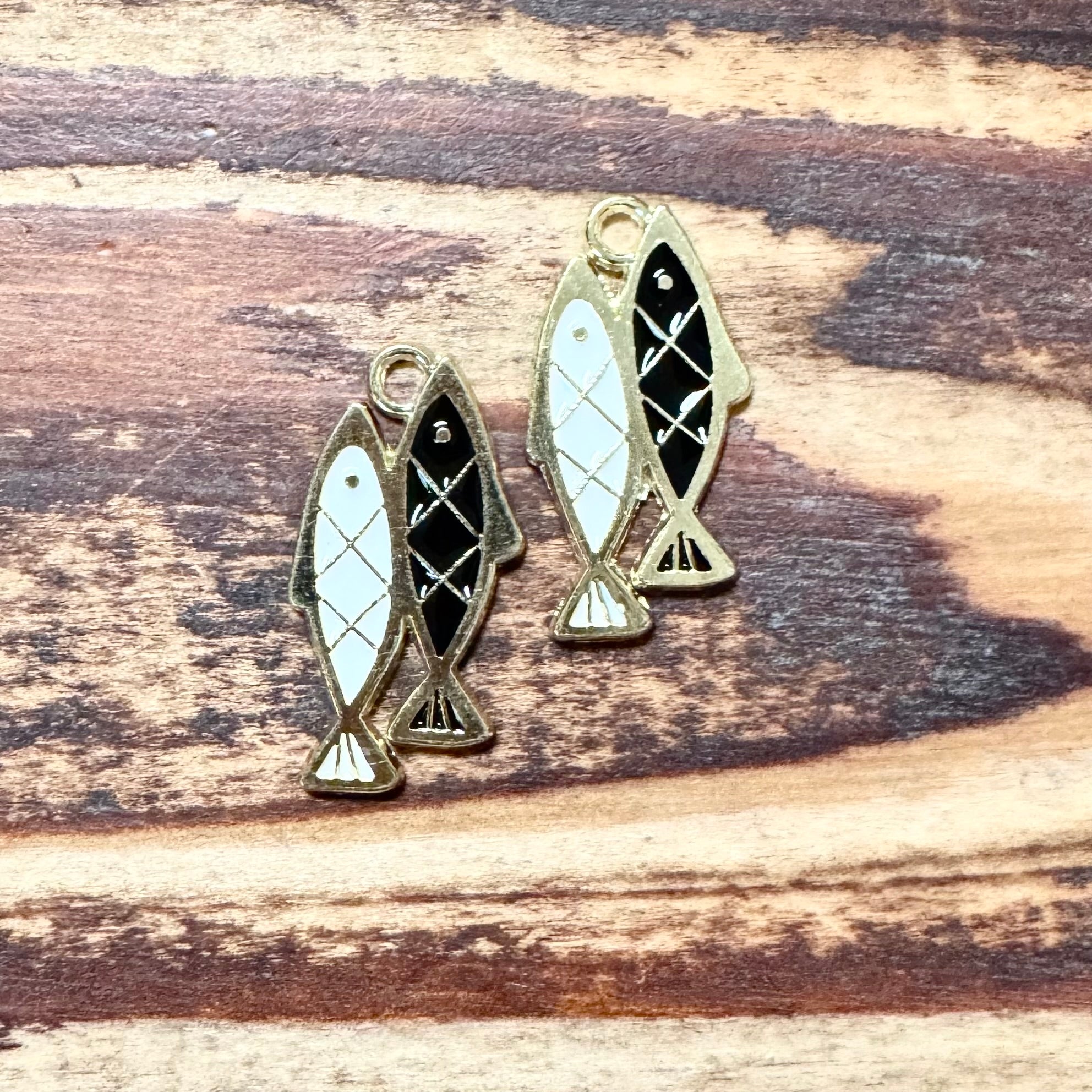 BCB-1449 - Antique Gold Enamel Double Fish Pendant, Black/White, 12x24mm | Pkg 2