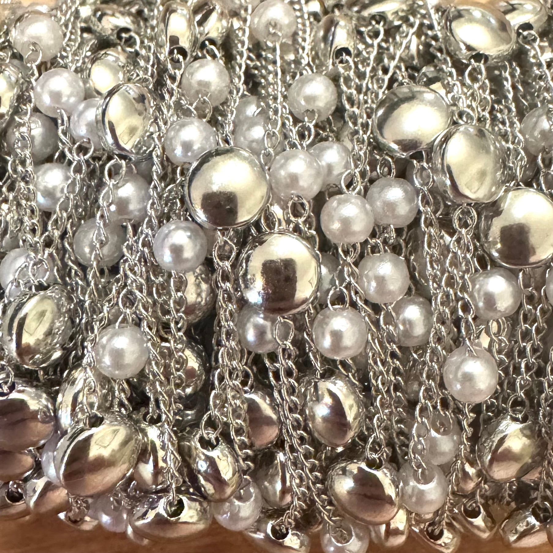 BCB-1811 - Silver Plated Brass Chain With Beads and Synthetic Pearl, 4/6mm | Pkg 3 Ft