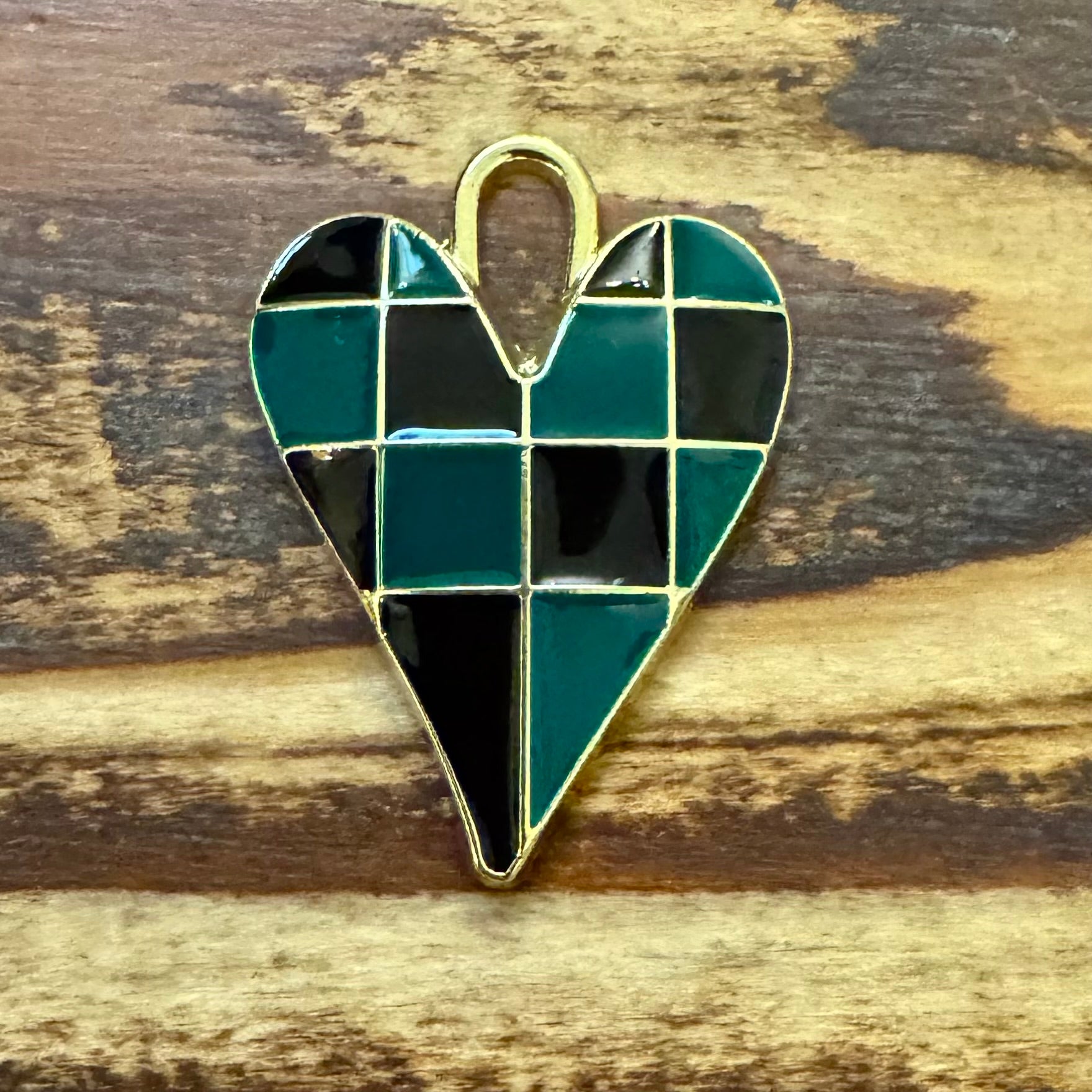 BCB-0926 - Gold Plated Enamel Patchwork Heart Pendant, Black/Green, 35x25mm | Pkg 1