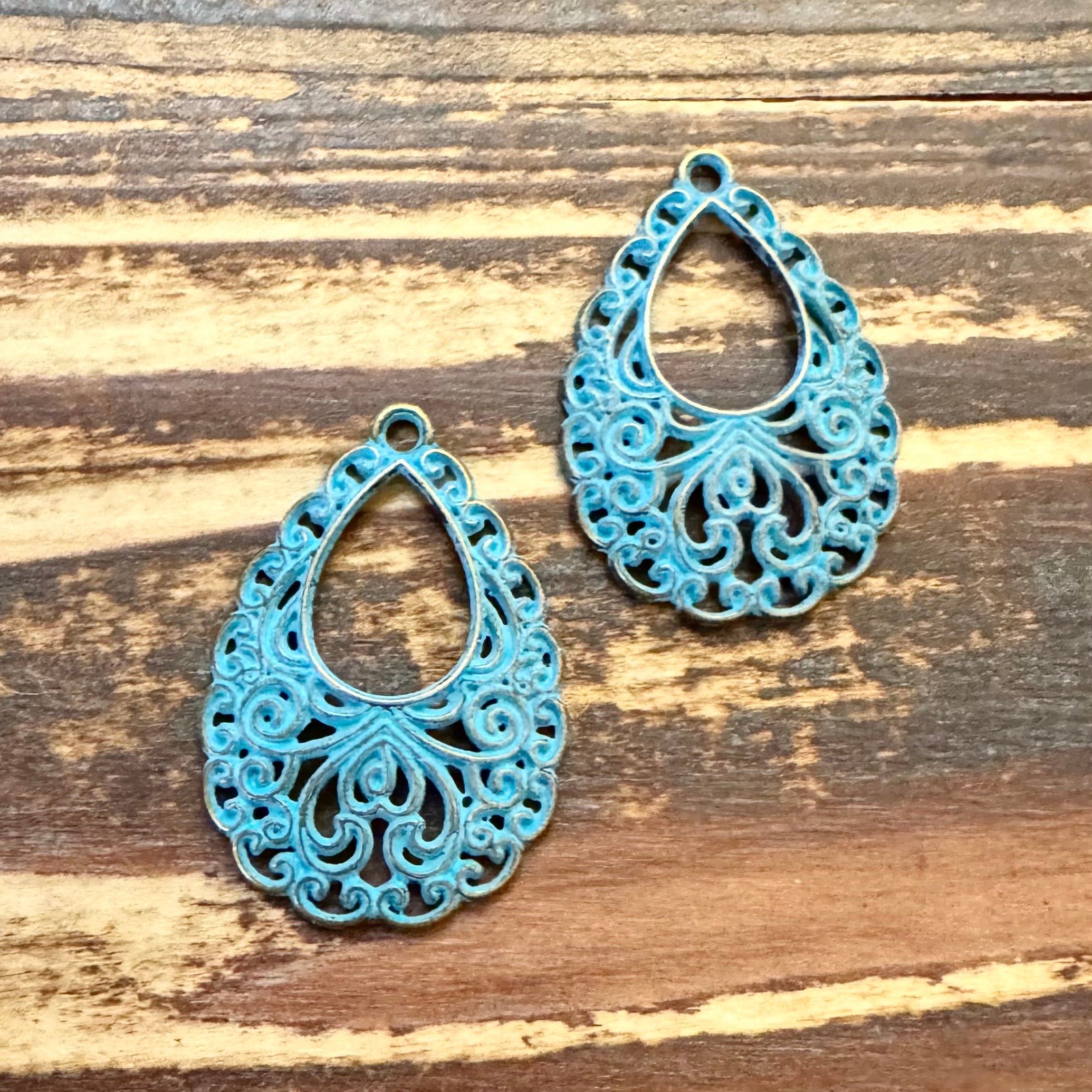 ABA-1096 - Antique Gold With Patina Lacy Teardrop Pendant, 25x35mm | Pkg 2
